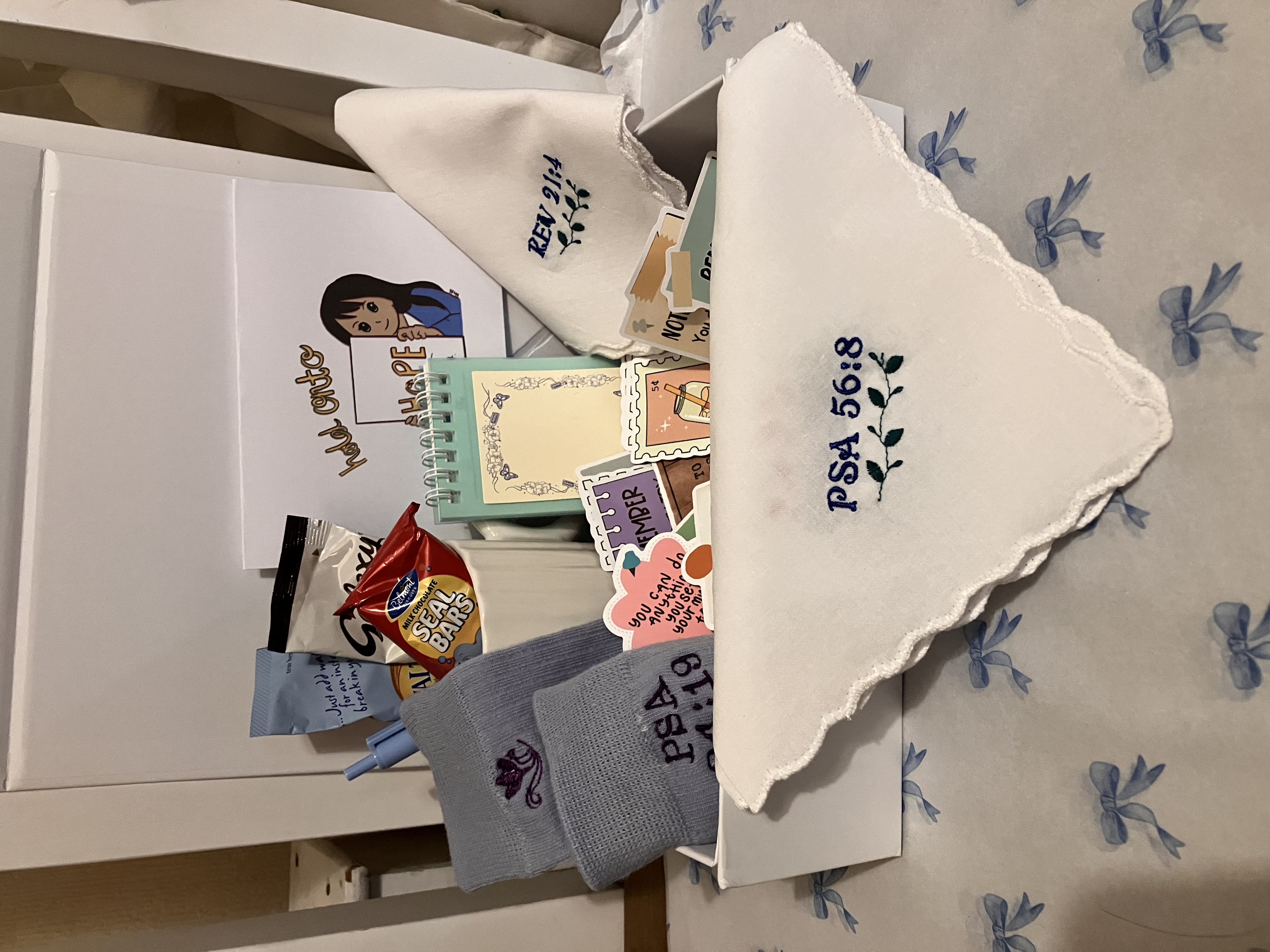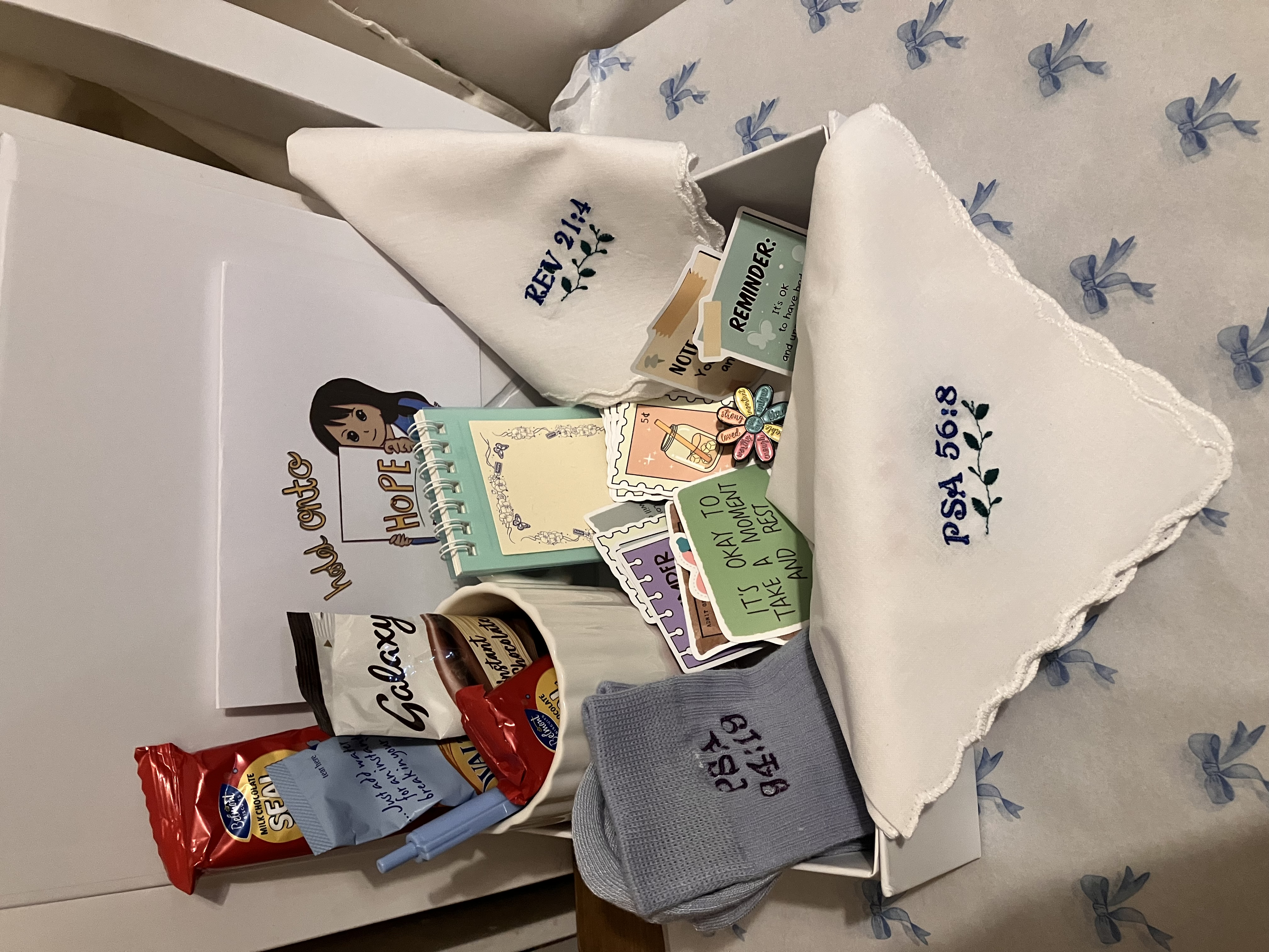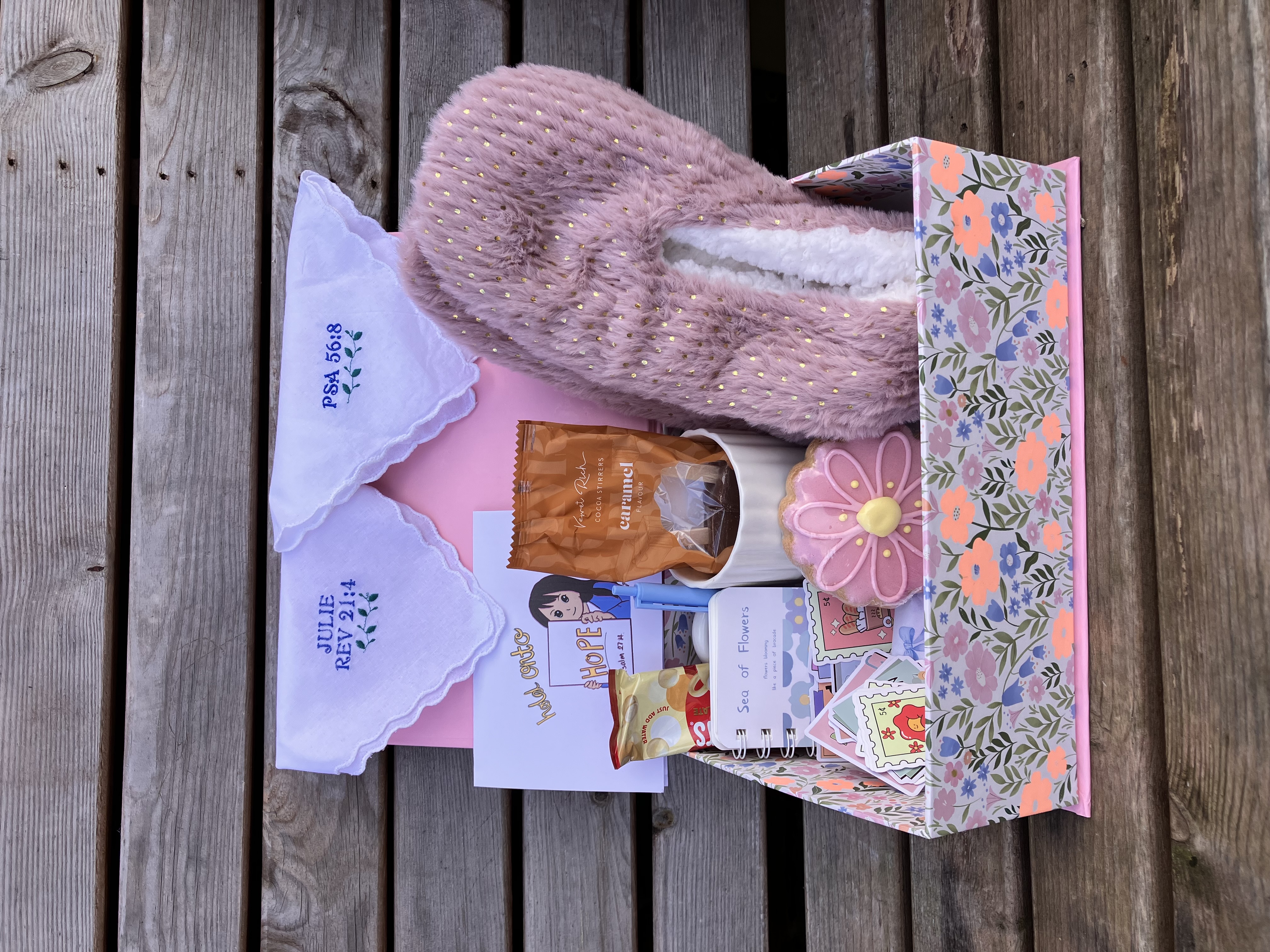 Contained in this delicate box is a range of cards with positive thoughts, a notebook they can use to jot down positive thoughts, a mug, some sachets of hot chocolate (or dipping chocolate depending on availability), some comfy slippers and a selection of embroidered gifts.
