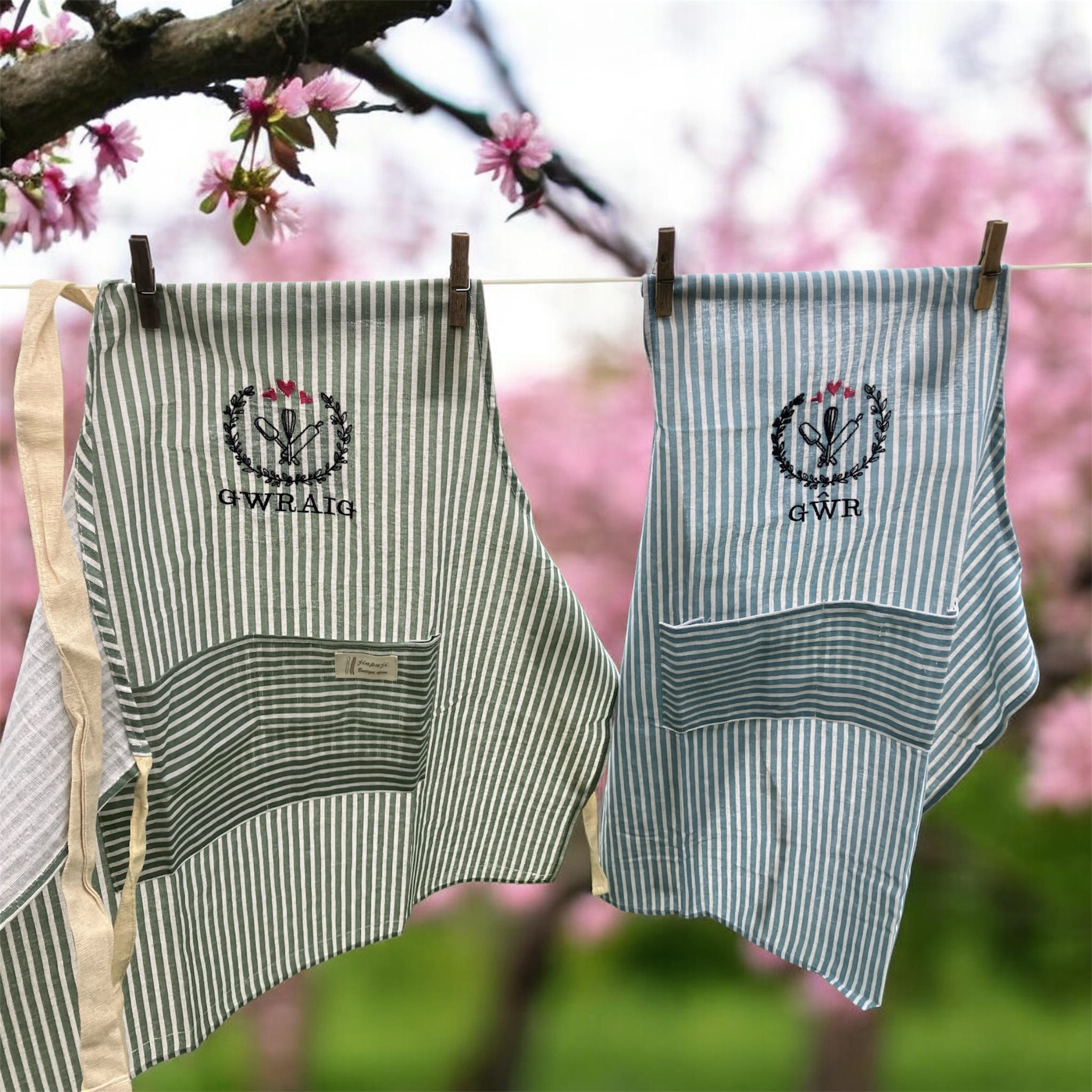 Are you a couple who love to bake? You'll be ready for the Couples Bake Off finale with these stripey blue and white aprons featuring the words Gwr (Husband) and Gwraig (Wife).