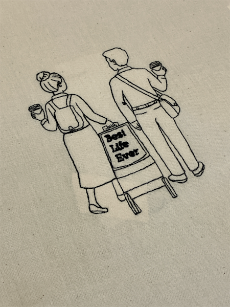 Monochrome line drawing design of two sisters about to engage in cart witnessing.